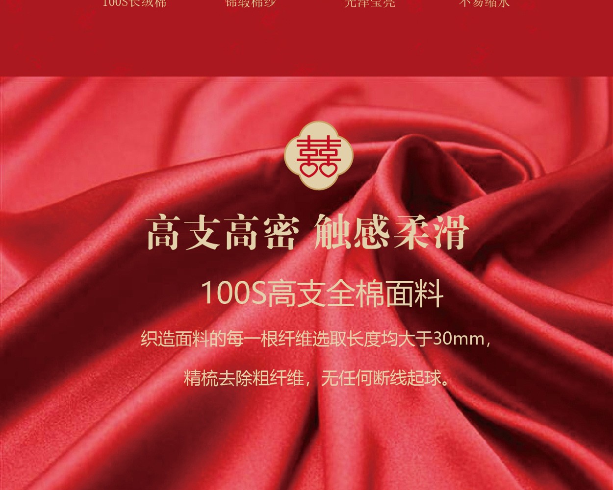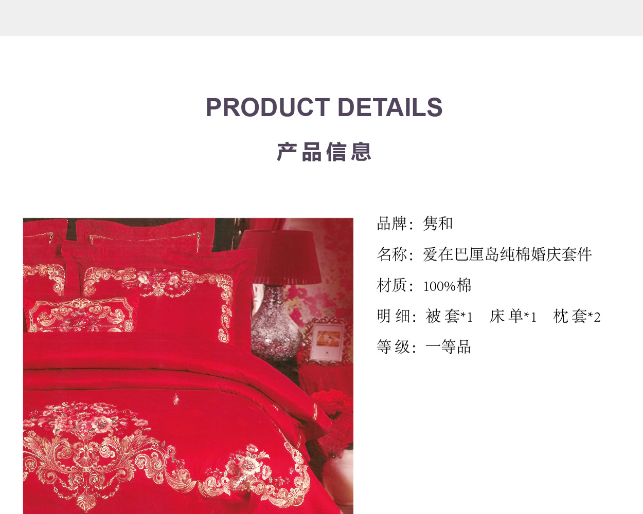 描述:大红喜庆风婚庆四件套,设计融入传统婚庆意象,大红花绣花寓意着爱情的甜美和一生的祝福,100%选用优质新疆长绒棉编织而成,比起普通全棉四件套具有缩水率低,不易掉色,更加柔软亲肤等特点,高支高密的双色立体提花工艺,加上写实的表现手法,让图案表现的更加细腻生动。
