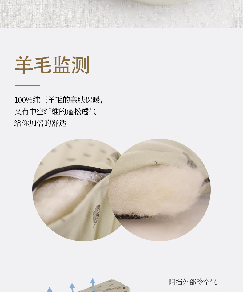 描述:挑选高品质羊毛填充,卷曲特性能够存储大量空气,提温不易流散更保暖 层层甄选,经过碳化处理工艺脱去油脂与杂质,杂质少清洁度高,安全无异味