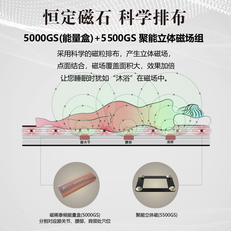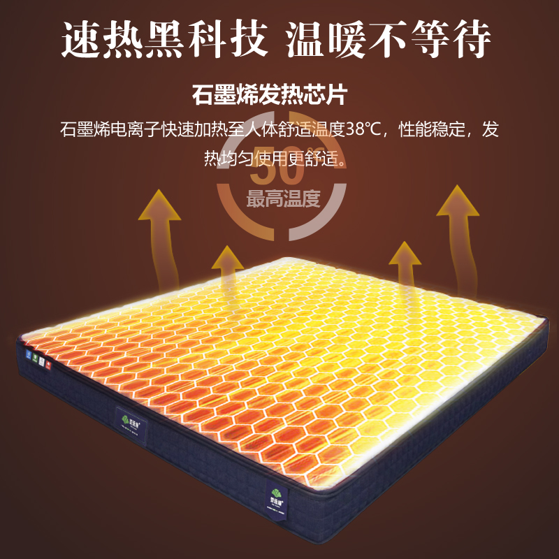 描述:床垫采用石墨烯发热层、恒定能量磁场层、负离子释放层、高密度棉等19层复合材料结构、石墨烯电离子快速加热至人体舒适温度38°C温软好床垫、睡着的时候还能发射磁及远红外负离子、让你在睡眠中被动养生,尽情享受好睡眠。